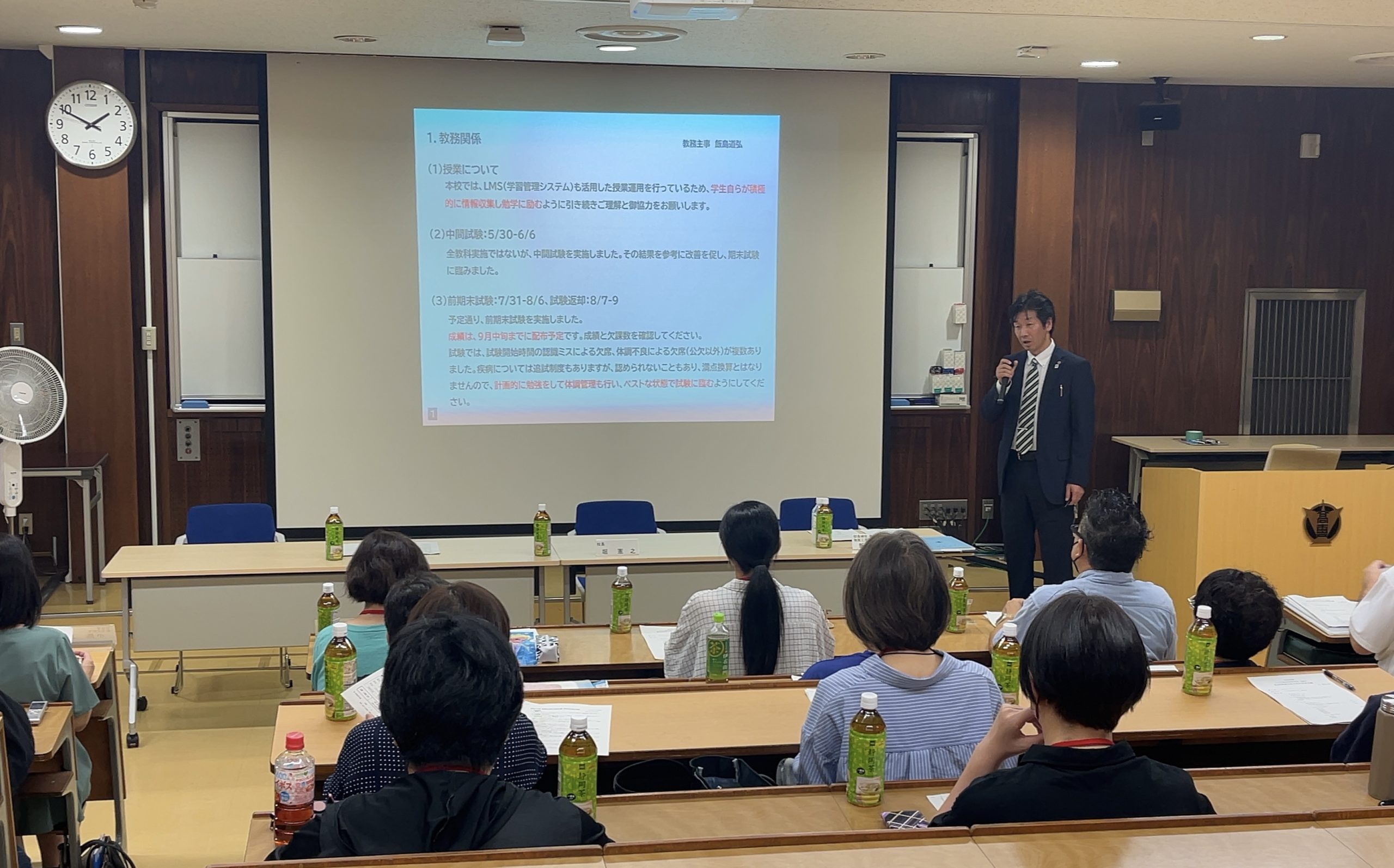 横山後援会長、堀校長 ご挨拶のあと、飯島先生より学校近況報告として、教務・学生・学寮・専攻科・国際交流に関する前期授業や課外活動、進路状況、後期の予定等のお話がありました。