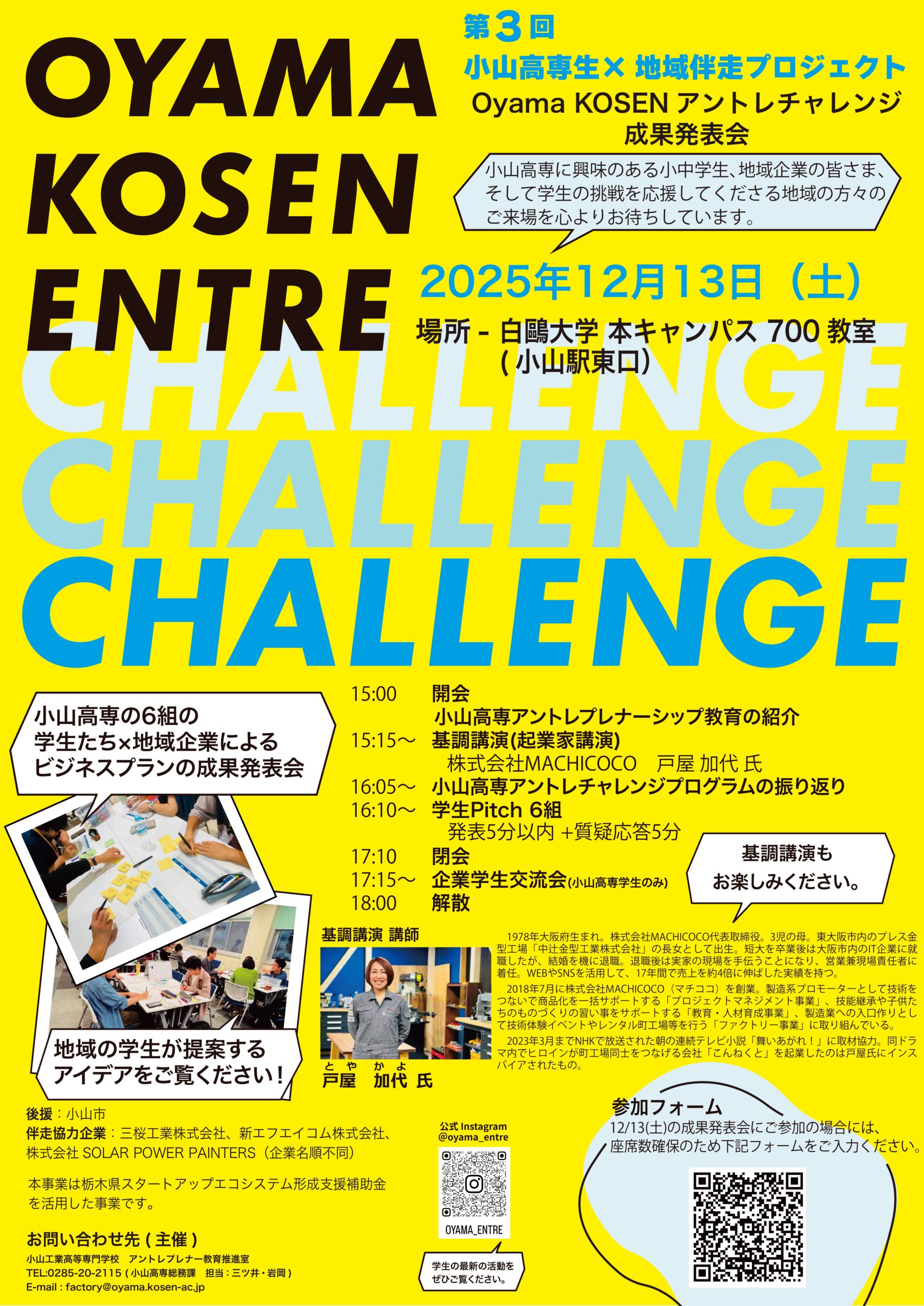 小山高専より、12/13(土)のアントレプレナーに関するイベントのご案内がございましたので周知いたします。