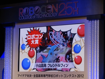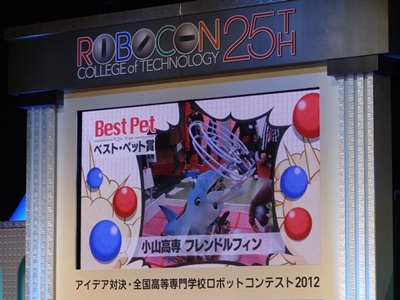先日、国技館で開催された「アイデア対決・全国高等専門学校ロボットコンテスト2012」において、小山高専のロボット「フレンドルフィン」がロボコンの最高賞である「ロボコン大賞」を獲得しました。また、投票で最もペットらしい豊かな表情をみせたロボットを選ぶ「ベスト・ペット賞」にも2位に大差を付けて選ばれました。